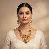 Celebrate timeless tradition with our Temple Design Long Haram, inspired by South Indian temple artistry. Each piece is meticulously handcrafted by skilled artisans using premium brass and coated with antique gold plating for a rich, divine finish.