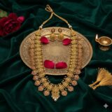 Celebrate timeless tradition with our Temple Design Long Haram, inspired by South Indian temple artistry. Each piece is meticulously handcrafted by skilled artisans using premium brass and coated with antique gold plating for a rich, divine finish.